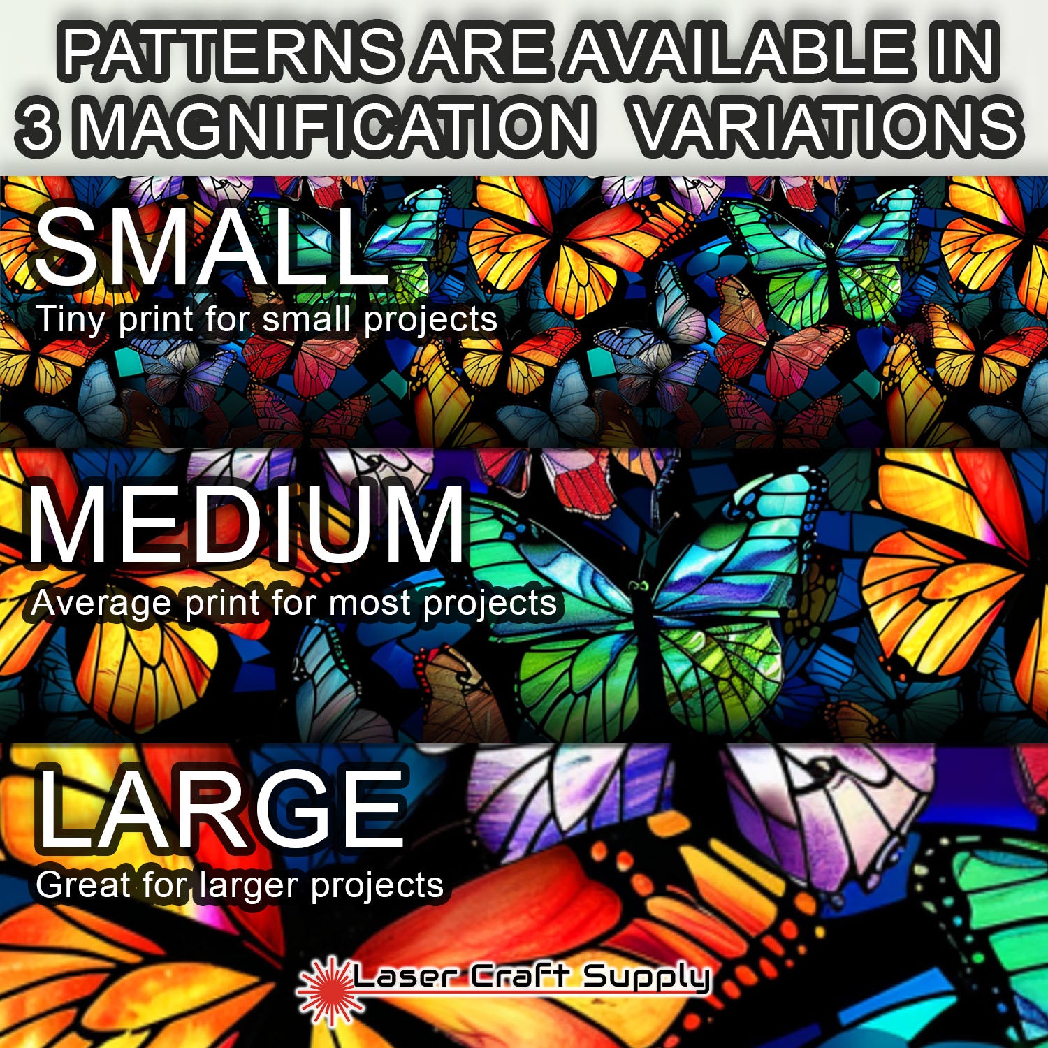 ALL SHEETS ARE 12" X 19" and Designs are available in 3 different Magnifications... Small, Medium and Large, and varies in thickness depending on the choice you make.