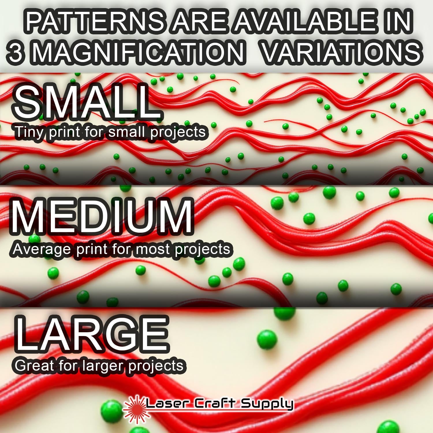 ALL SHEETS ARE 12" X 19" and Designs are available in 3 different Magnifications... Small, Medium and Large, and varies in thickness depending on the choice you make.
