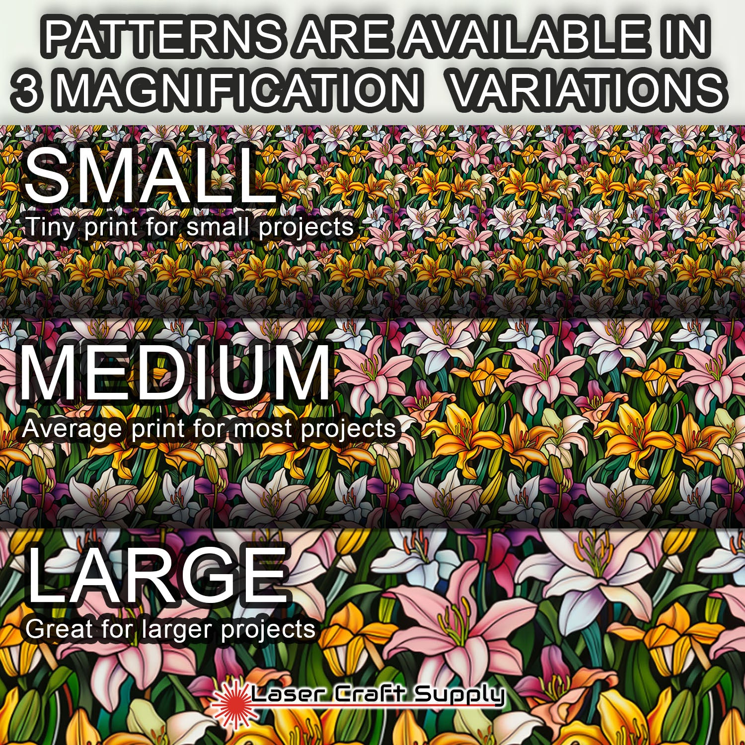 ALL SHEETS ARE 12" X 19" and Designs are available in 3 different Magnifications... Small, Medium and Large, and varies in thickness depending on the choice you make.