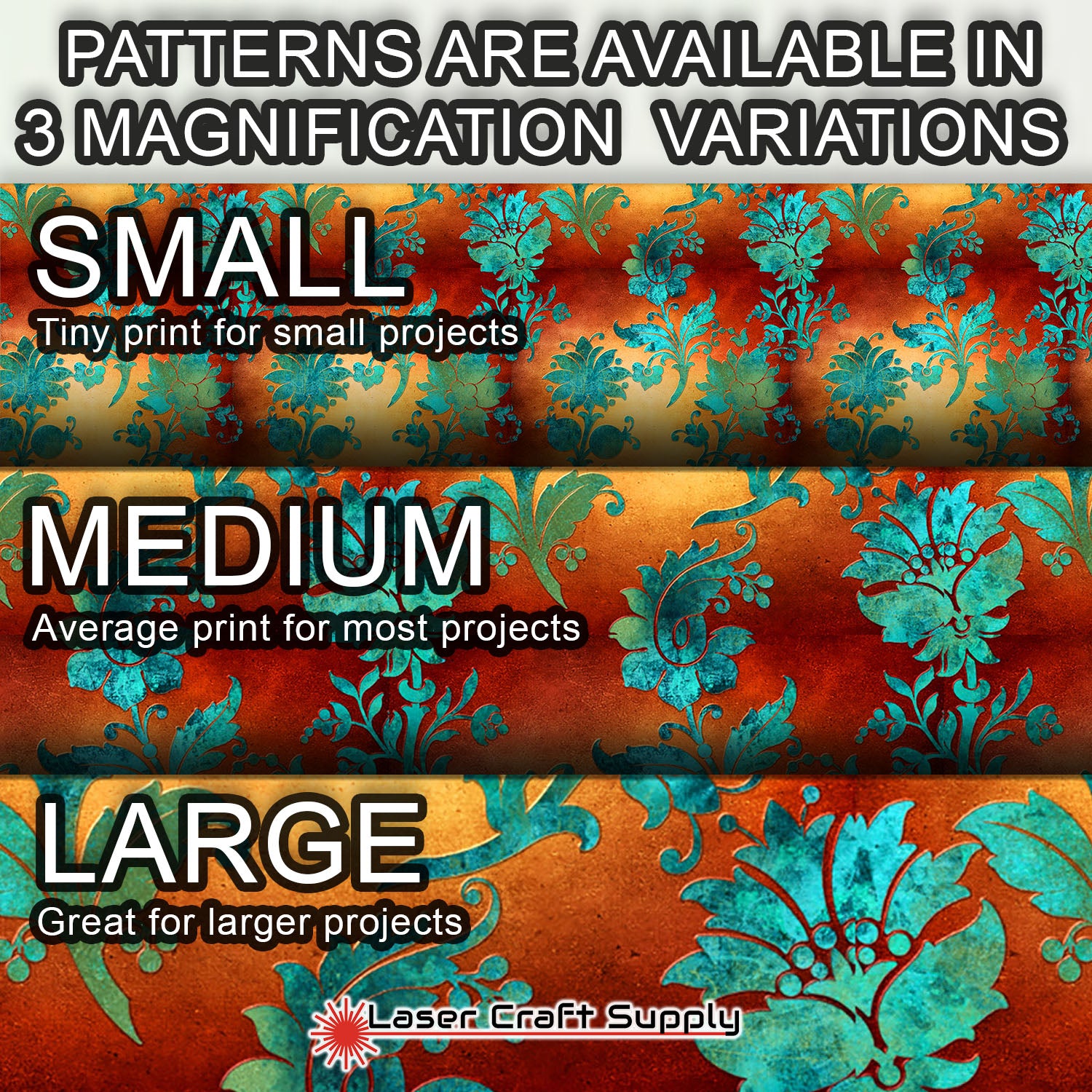 ALL SHEETS ARE 12" X 19" and Designs are available in 3 different Magnifications... Small, Medium and Large, and varies in thickness depending on the choice you make.