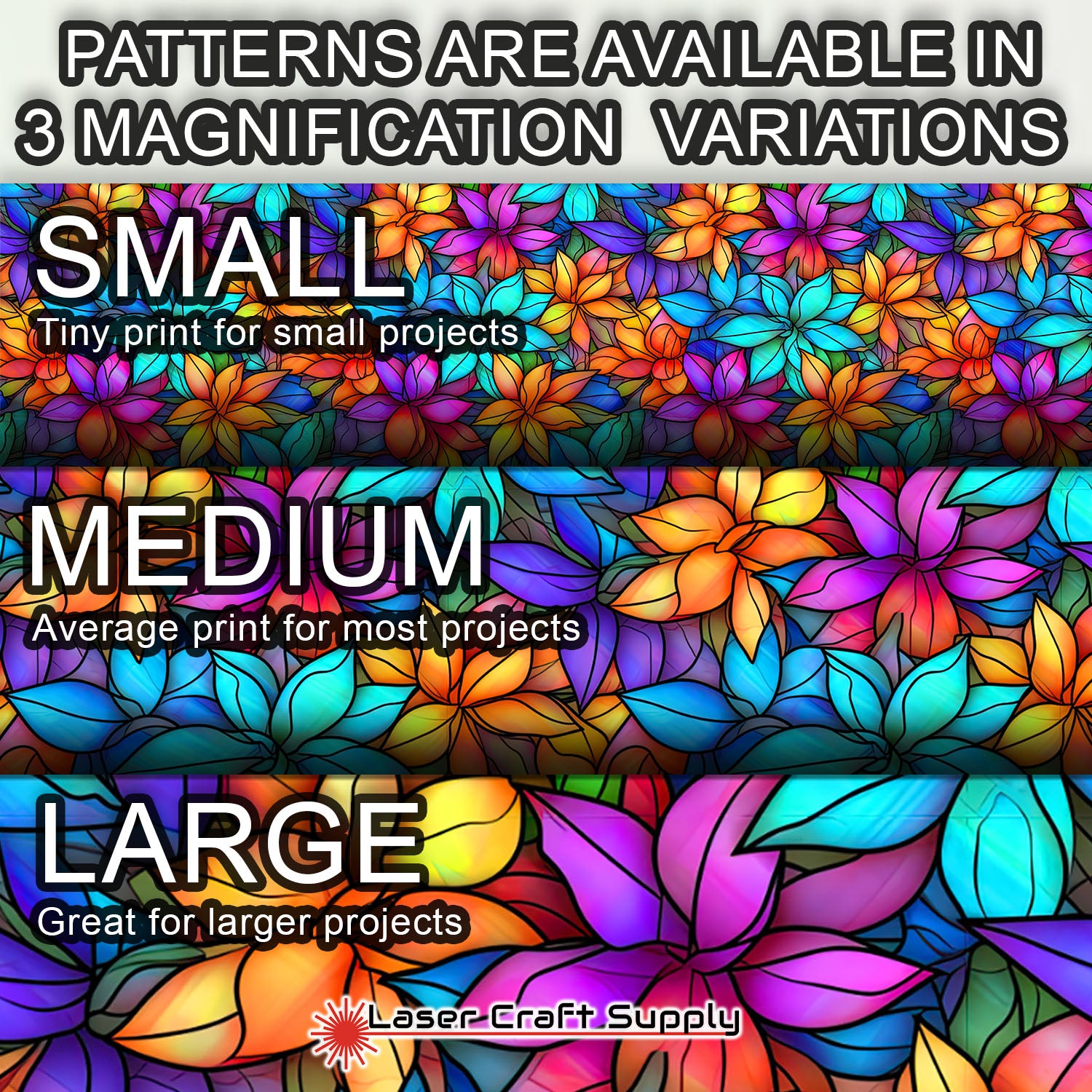 ALL SHEETS ARE 12" X 19" and Designs are available in 3 different Magnifications... Small, Medium and Large, and varies in thickness depending on the choice you make.