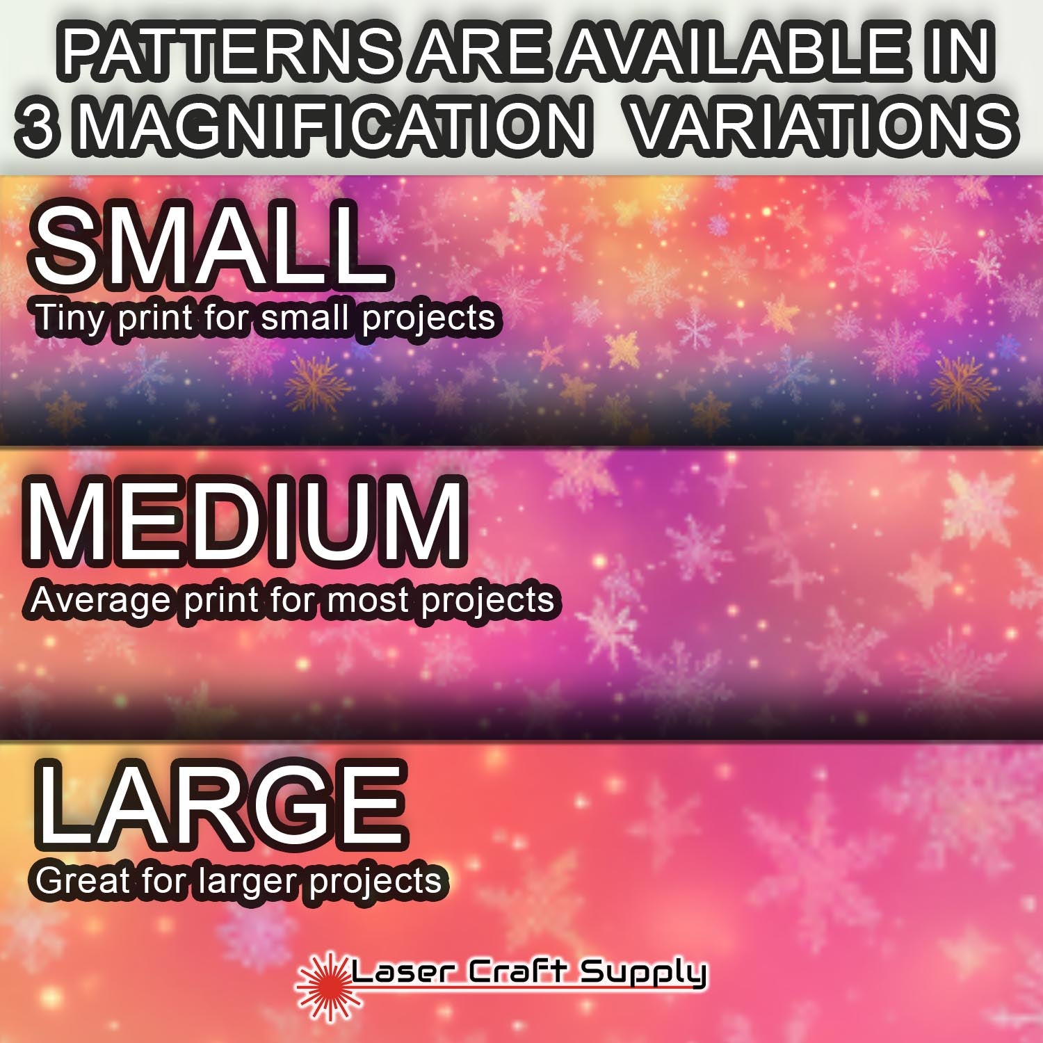ALL SHEETS ARE 12" X 19" and Designs are available in 3 different Magnifications... Small, Medium and Large, and varies in thickness depending on the choice you make.