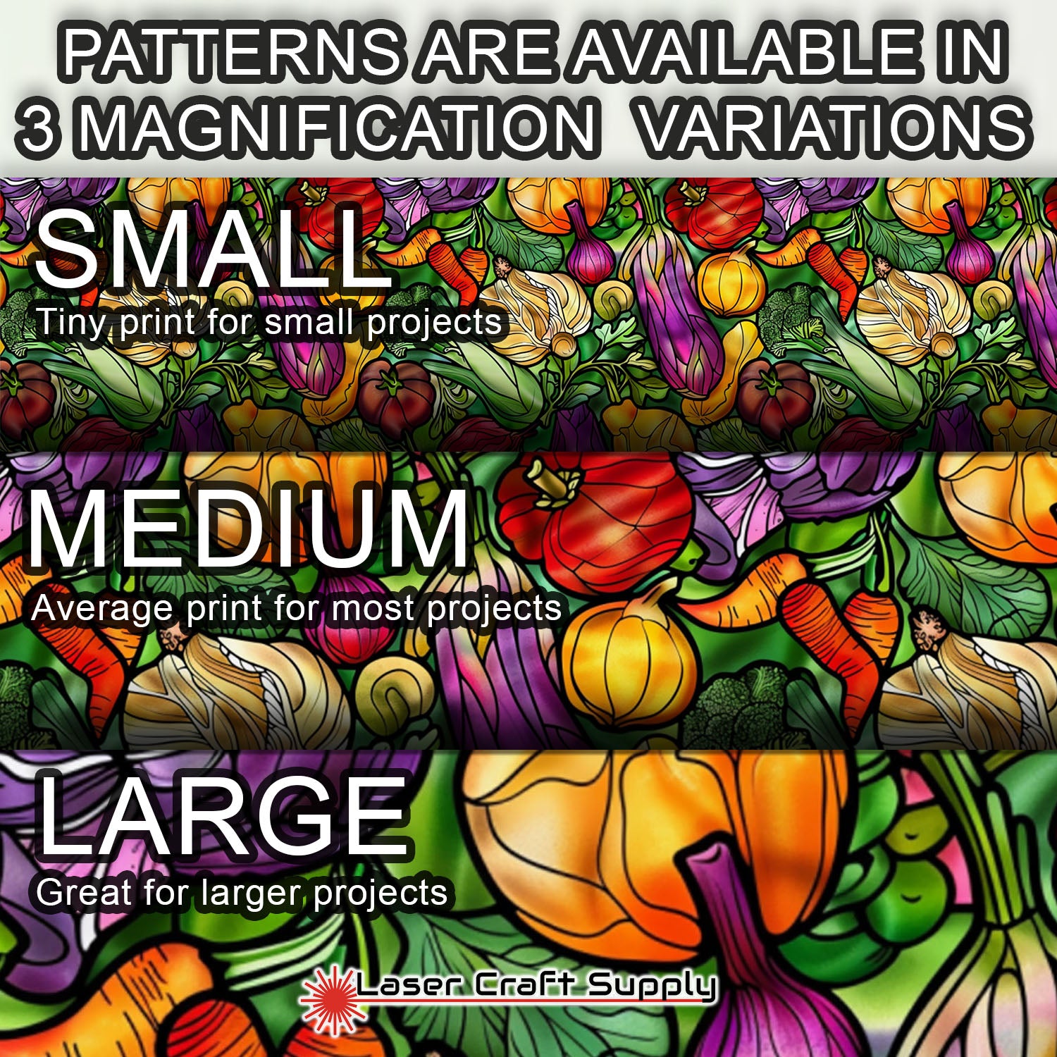 ALL SHEETS ARE 12" X 19" and Designs are available in 3 different Magnifications... Small, Medium and Large, and varies in thickness depending on the choice you make.