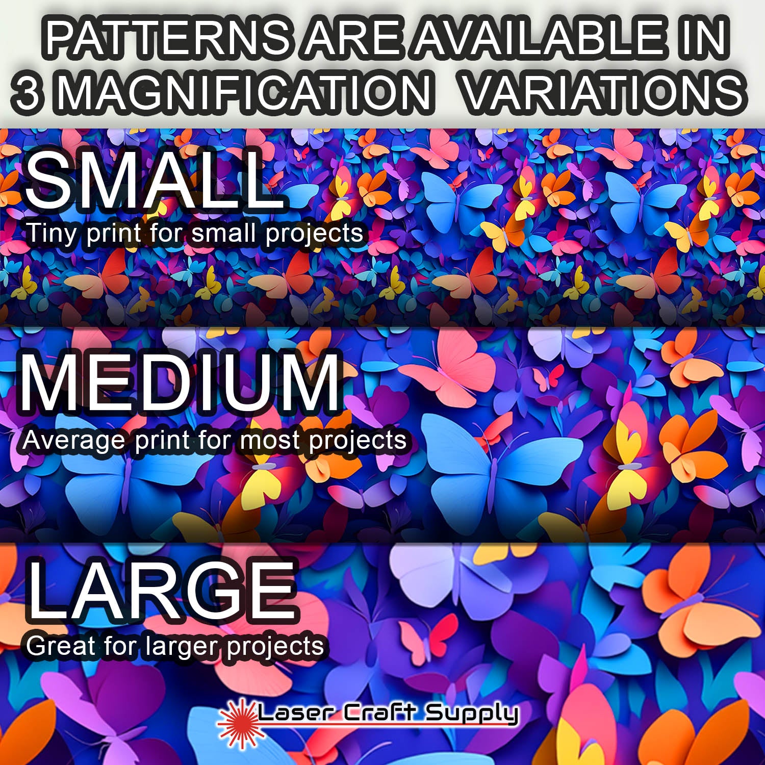 ALL SHEETS ARE 12" X 19" and Designs are available in 3 different Magnifications... Small, Medium and Large, and varies in thickness depending on the choice you make.