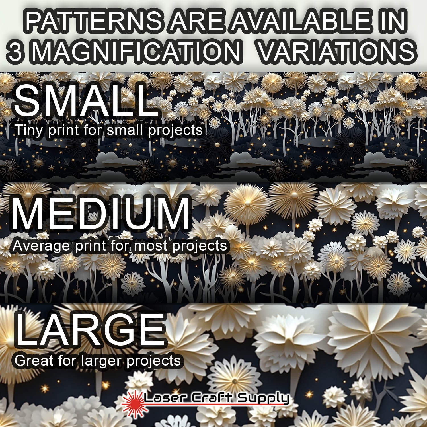 ALL SHEETS ARE 12" X 19" and Designs are available in 3 different Magnifications... Small, Medium and Large, and varies in thickness depending on the choice you make.